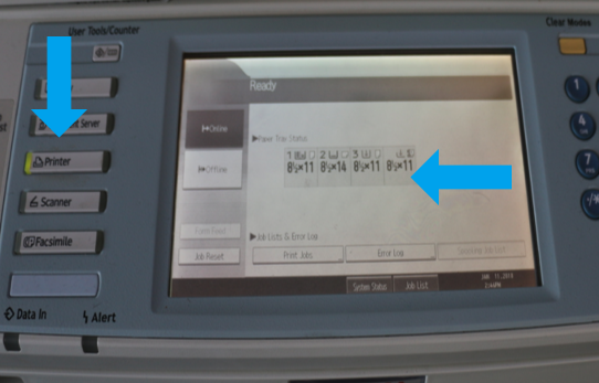 If you print a document and hear beeping from the printer you need to physically select paper and a paper tray before your document can be printed. To do this, hit the printer button and then select the paper size and tray form the touchscreen.
